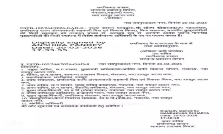 रायपुर: छत्तीसगढ़ राज्य शासन ने प्रशासनिक स्तर पर महत्वपूर्ण फेरबदल करते हुए दो अधिकारियों की नई नियुक्तियों के आदेश जारी किए हैं। इन नियुक्तियों में मुख्यमंत्री सचिवालय और नगरीय प्रशासन विभाग में जिम्मेदारी सौंपी गई है।