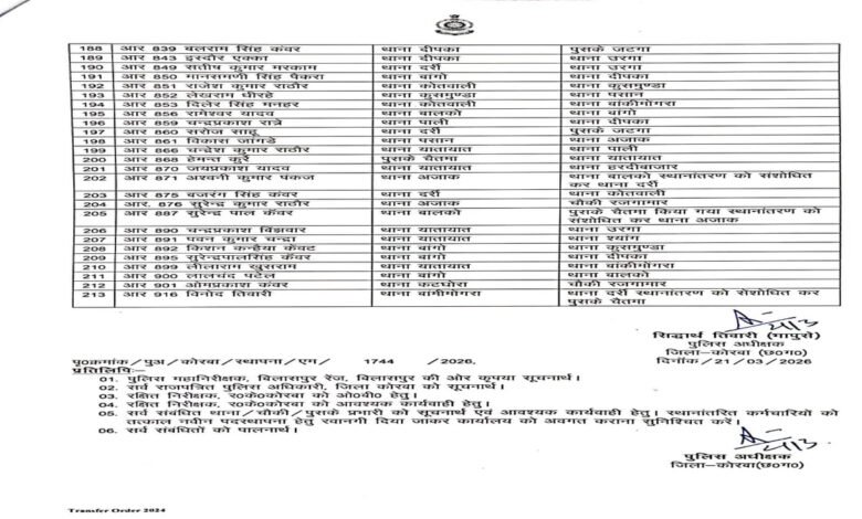 कोरबा: जिला पुलिस अधीक्षक (SP) ने जिले की पुलिसिंग व्यवस्था में कसावट लाने के उद्देश्य से शनिवार को एक बड़ी तबादला सूची जारी की है। इस आदेश के तहत कुल 187 पुलिसकर्मियों को इधर से उधर किया गया है।