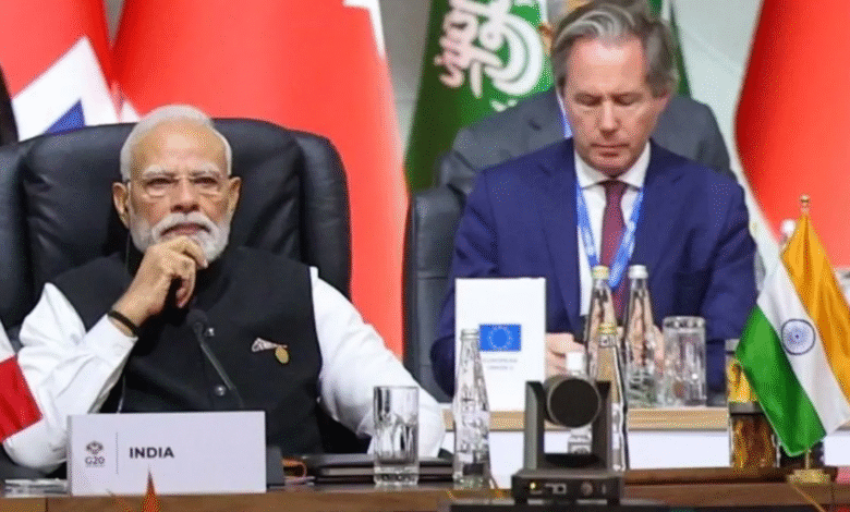 gmedianews24.com/जोहान्सबर्ग/नई दिल्ली। तीन दिवसीय G20 लीडर्स समिट 2025 के लिए साउथ अफ्रीका पहुंचे प्रधानमंत्री नरेंद्र मोदी ने पहले दिन कई अहम वैश्विक मुद्दों पर भारत का दृष्टिकोण रखा। समिट के शुरुआती सत्र “इनक्लूसिव और सस्टेनेबल इकोनॉमिक ग्रोथ– किसी को पीछे न छोड़ना” पर फोकस रहा।