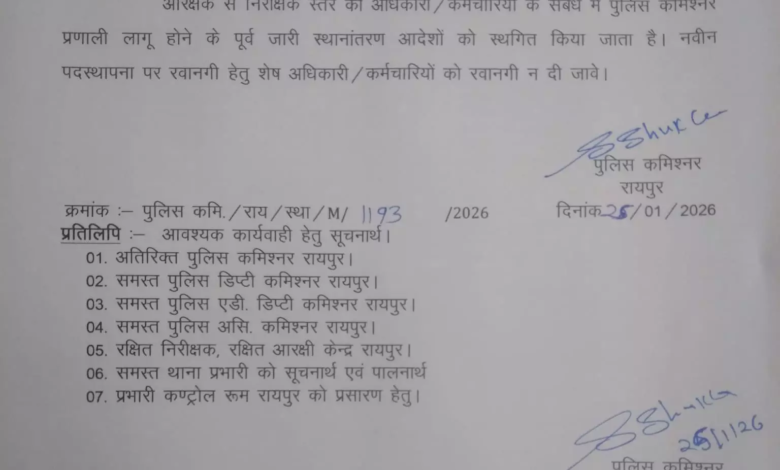 इस बीच रायपुर पुलिस आयुक्त डॉ. संजीव शुक्ला ने कमिश्नरेट प्रणाली के तहत आने वाले थाना क्षेत्रों को लेकर एक महत्वपूर्ण आदेश जारी किया है। उन्होंने पुलिस आयुक्त प्रणाली लागू होने से ठीक पहले जारी किए गए पुलिस अधिकारियों और कर्मचारियों के स्थानांतरण आदेशों पर तत्काल प्रभाव से रोक लगा दी है।