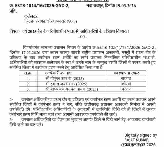 छत्तीसगढ़ में 2025 बैच के आईएएस अधिकारियों की पदस्थापना, विभिन्न जिलों में बने सहायक कलेक्टर
