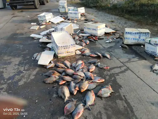 वाहन पलटते ही मछलियों से भरी बोरियां सड़क पर बिखर गईं। इसके बाद राहगीरों और स्थानीय लोगों ने मछलियां उठानी शुरू कर दीं, जिससे मौके पर भीड़ लग गई। चालक ने लोगों से मछलियां वापस करने की अपील की, लेकिन कई लोग मछलियां लेकर भाग गए।