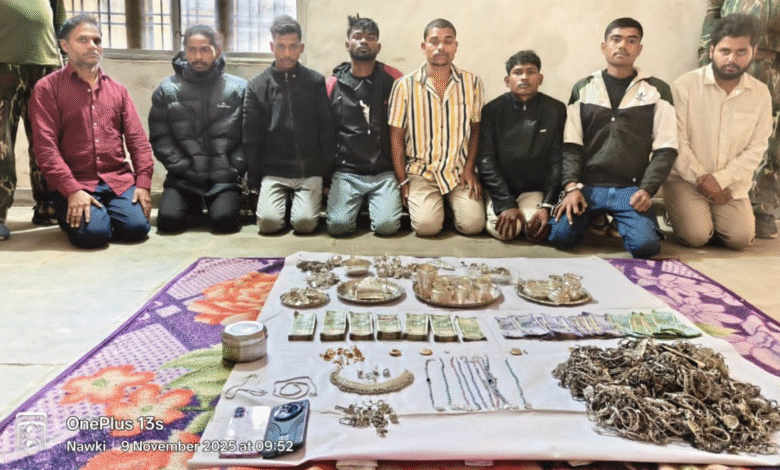 gmedianews24.com/बलरामपुर। धनंजय ज्वेलरी दुकान में 30-31 अक्टूबर की रात हुई बड़ी चोरी का पुलिस ने खुलासा कर दिया है। पुलिस ने इस मामले में 9 आरोपियों को गिरफ्तार किया है। आरोपियों के पास से सोना-चांदी, 3.5 लाख रुपए नकद, 4 टू-व्हीलर और 2 आईफोन बरामद किए गए हैं, जिनकी कुल कीमत करीब 50 लाख रुपए बताई जा रही है।