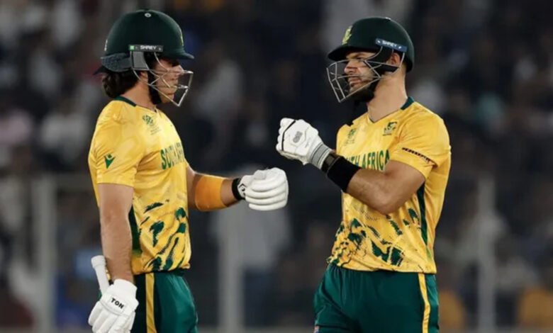 दक्षिण अफ्रीका: 123/4 (13.2 ओवर) – डेवाल्ड ब्रेविस 36, रिकेल्टन 30।